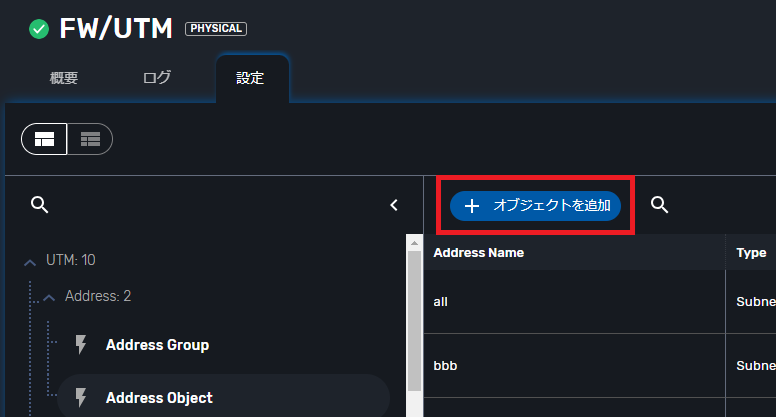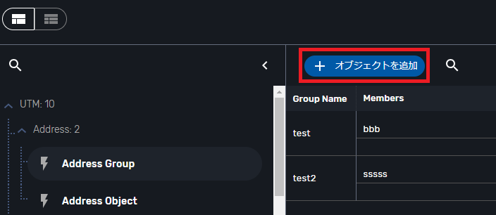 画面左側の「Address Group」をクリックし、画面中央の「オブジェクトを追加」をクリックします。