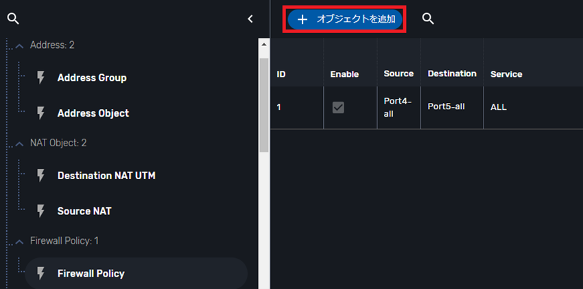 画面左側の「Firewall Policy」をクリックし、画面中央の「オブジェクトを追加」をクリックします。