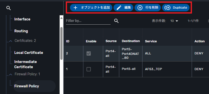 画面左側の「Firewall Policy」をクリックし、変更対象の行を選択して操作内容に応じてボタンをクリックします。