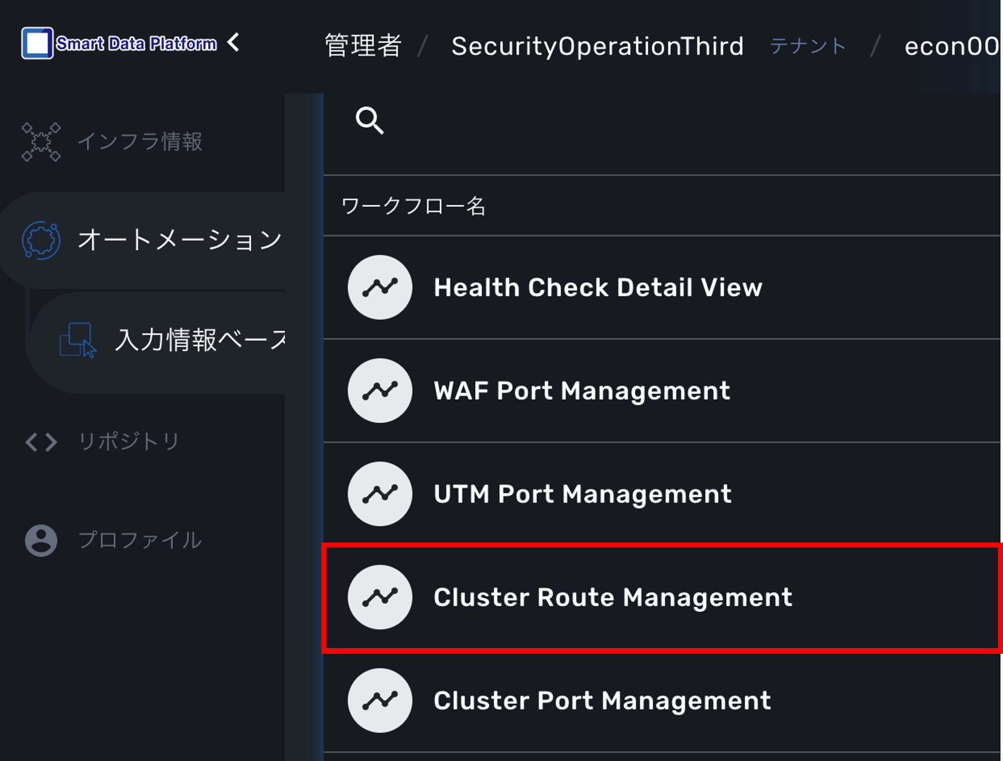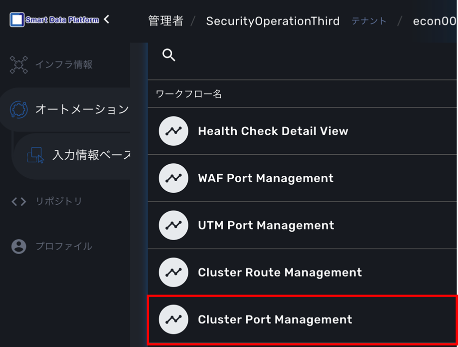 Smart Data Platformポータルにてワークスペースを選択後、「メニュー」をクリックします。