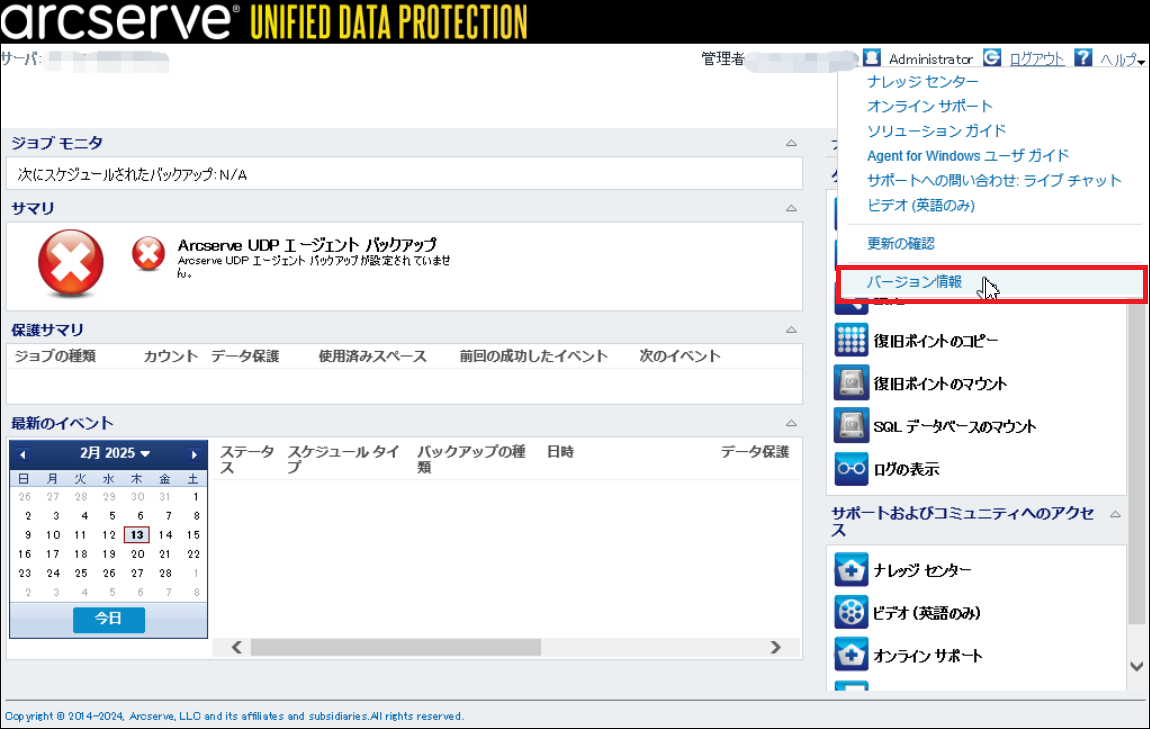 3.Arcserve UDP にログインし、[ヘルプ]—[バージョン情報]をクリックします。