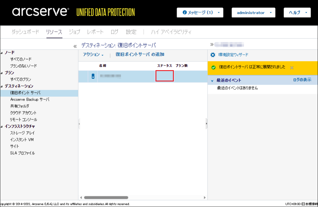 2.「Arcserve UDP コンソール」画面が開いたら、[リソース]—[デスティネーション]—[復旧ポイントサーバ]をクリックし、アップグレードする復旧ポイントサーバーを選択します。