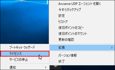 OSデスクトップ下部にあるタスクバーからArcserveのアイコンを選択し、メニューから[拡張]>[ライセンス]をクリックします。