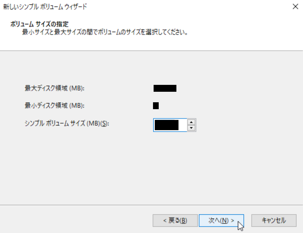 新しいシンプル ボリュームウィザード画面にて「次へ」をクリックします。