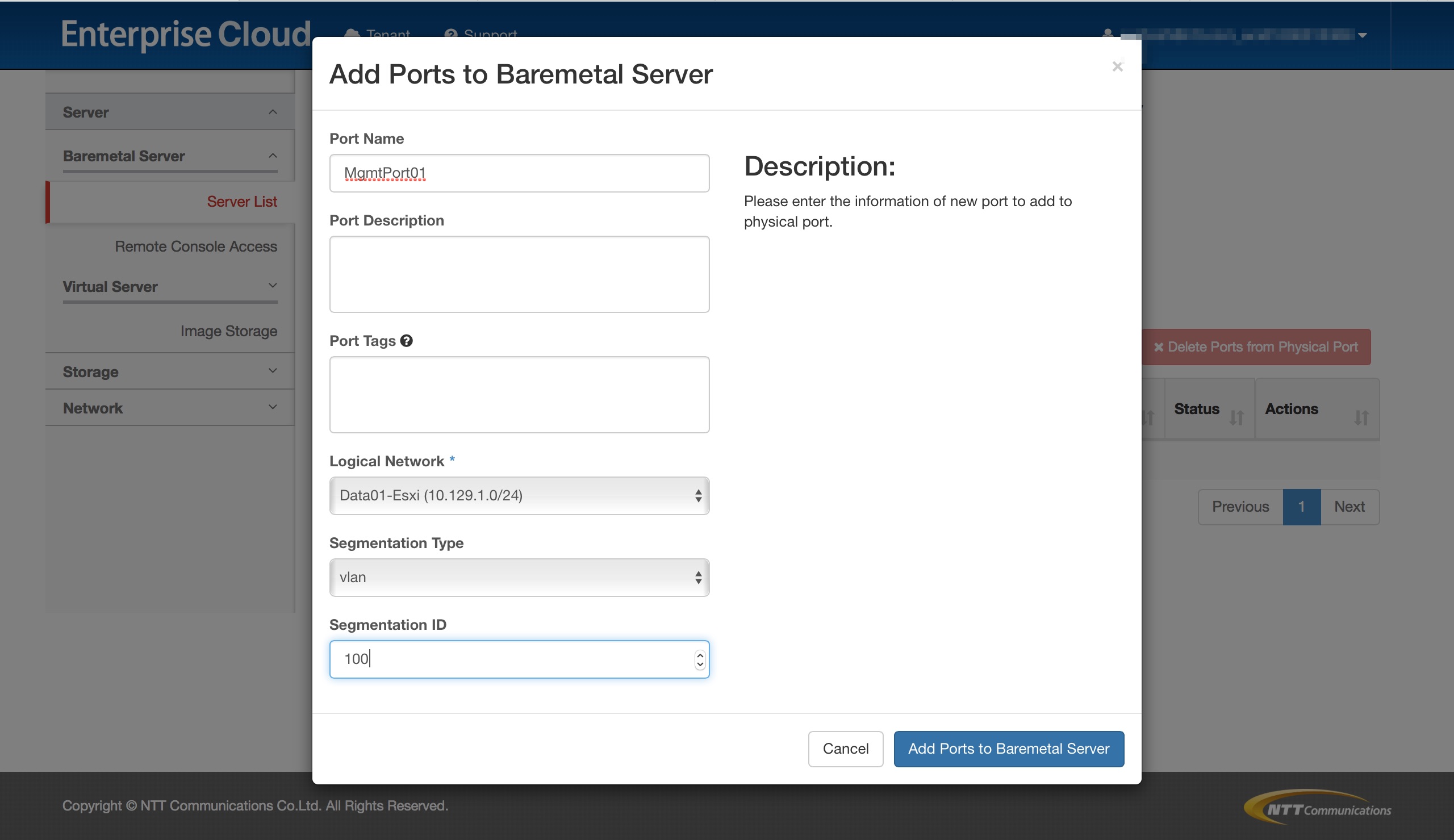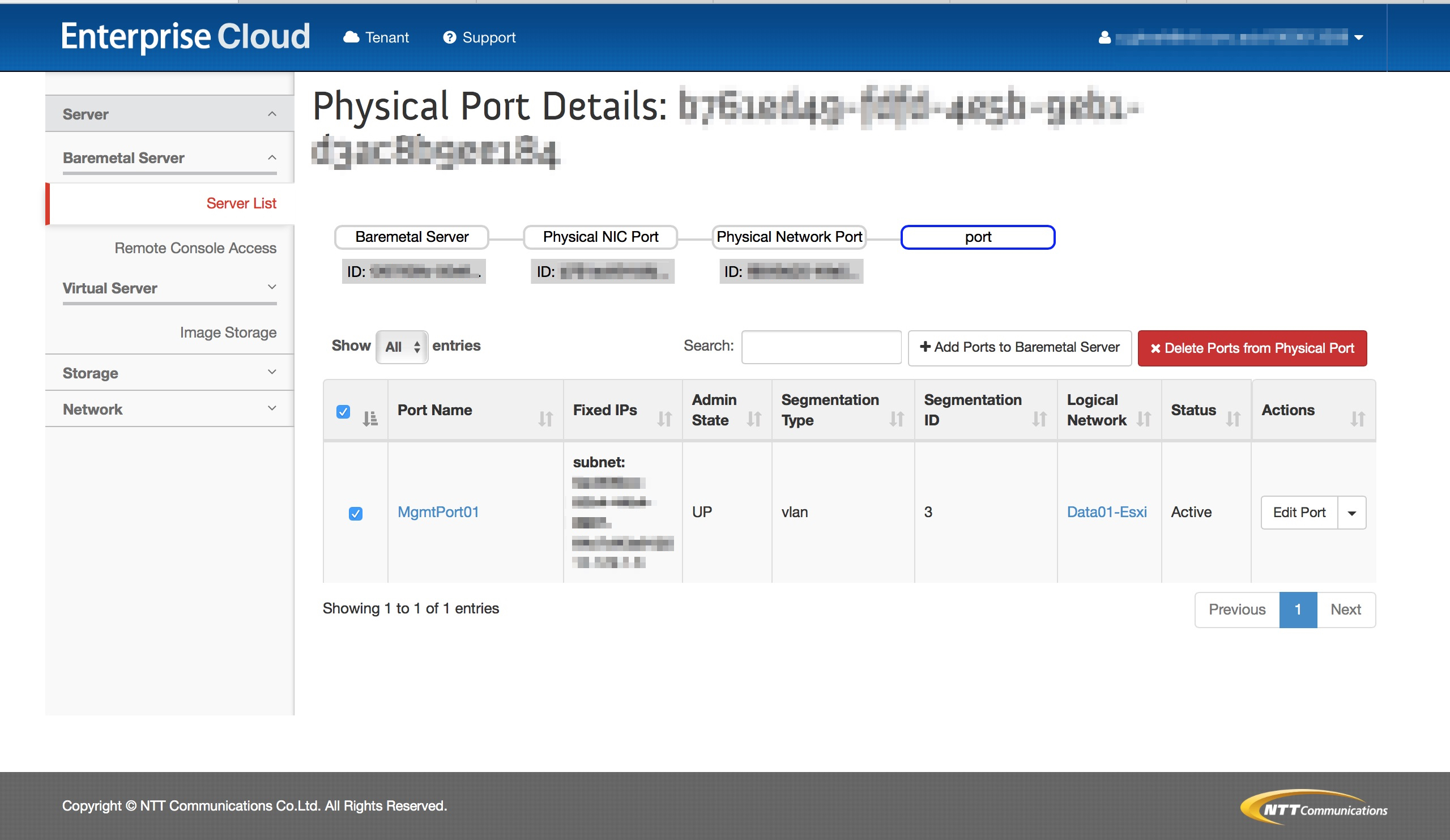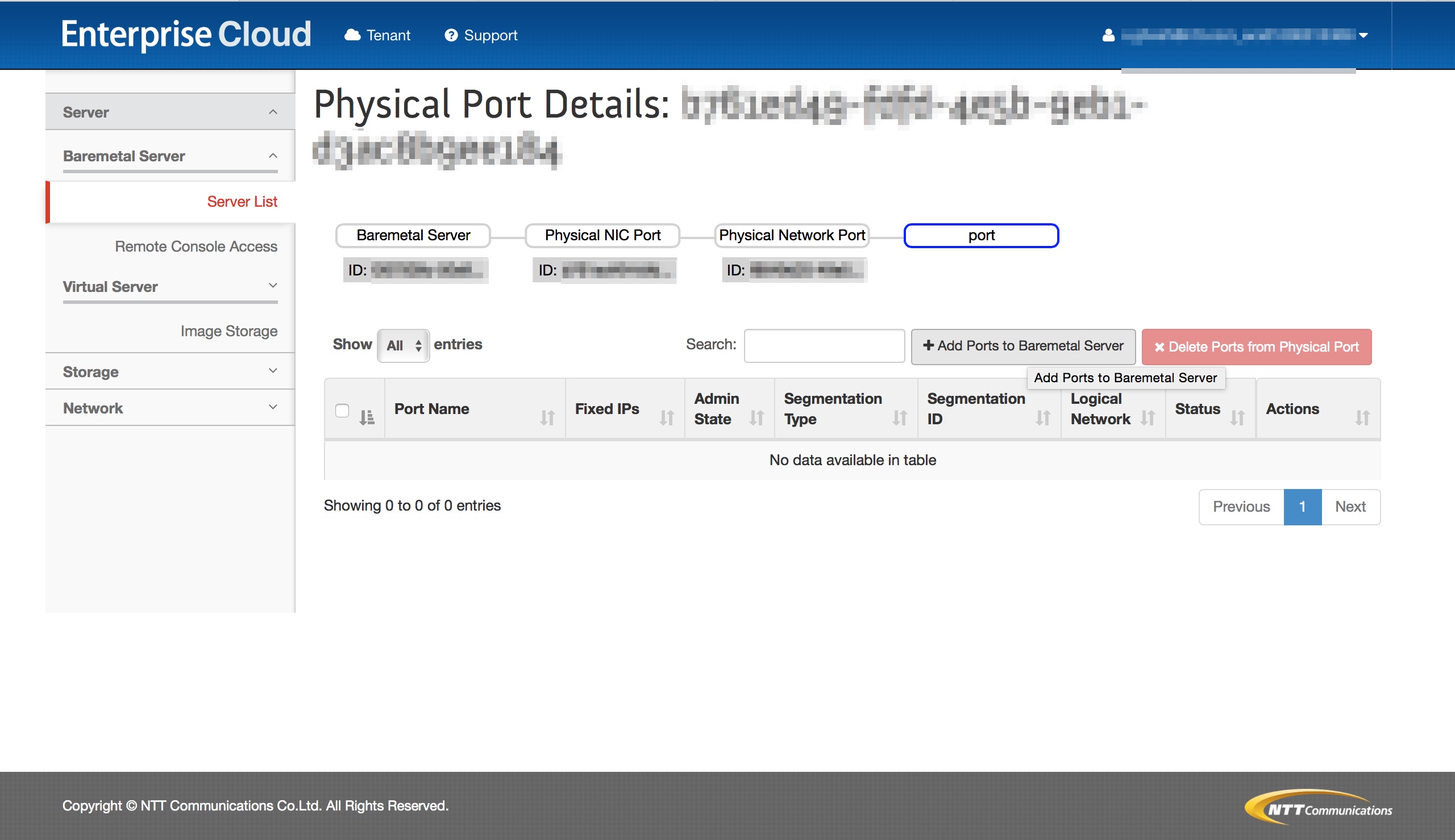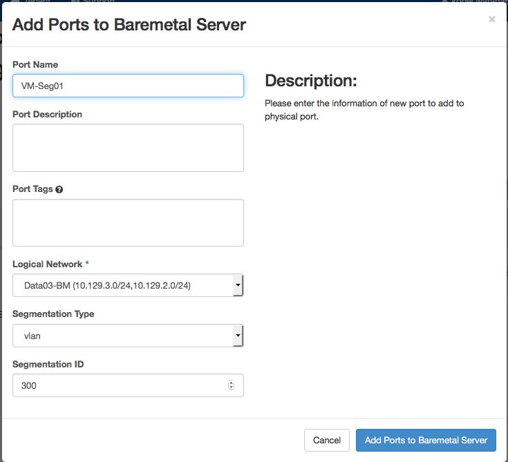 ベアメタルサーバーメニューで作成されるロジカルネットワークのポートはセグメントIDが3で設定されます。 セグメントIDを変更するために、ポートを削除し、当該ロジカルネットワークに新たなポートを作成します。