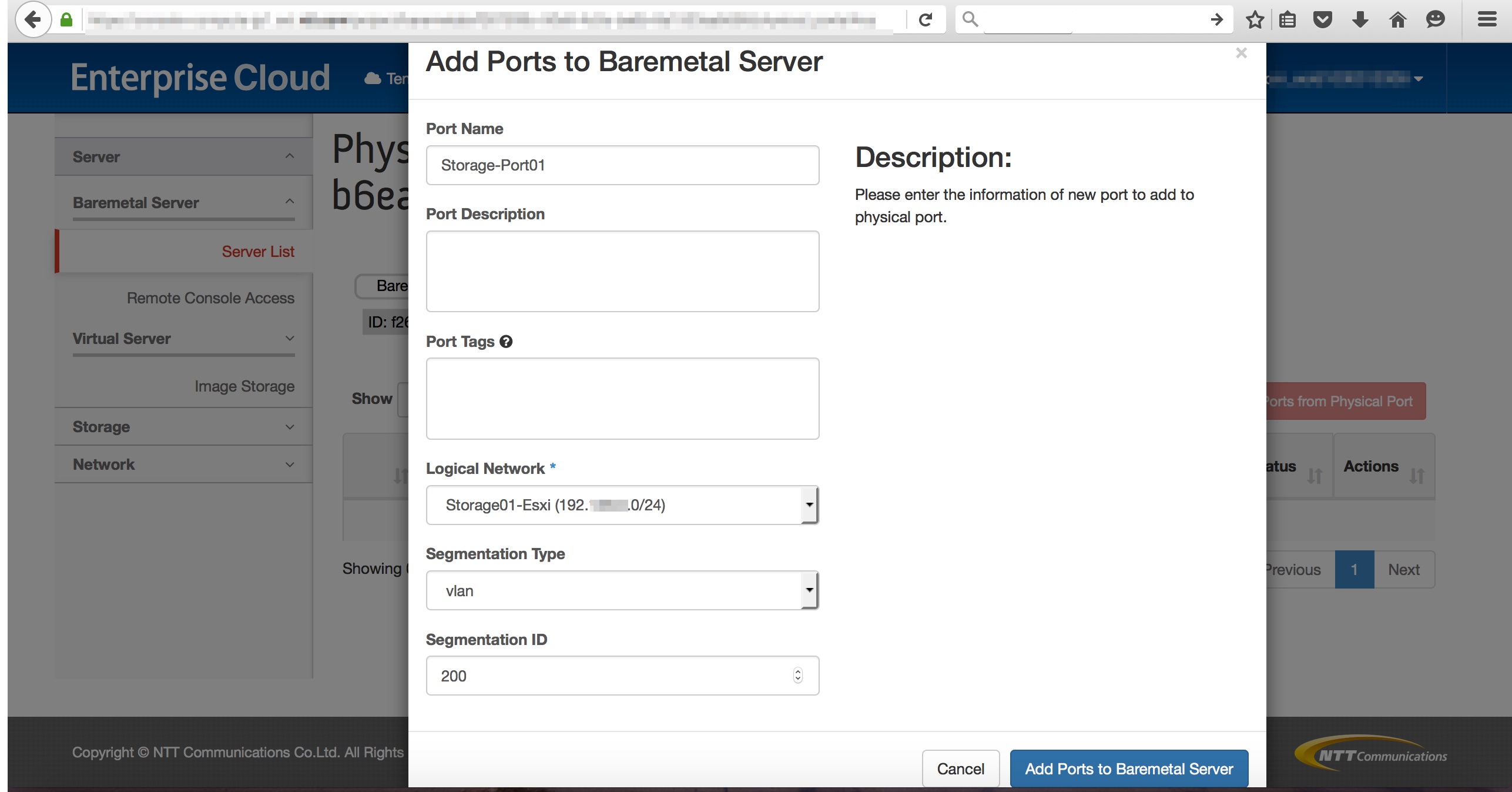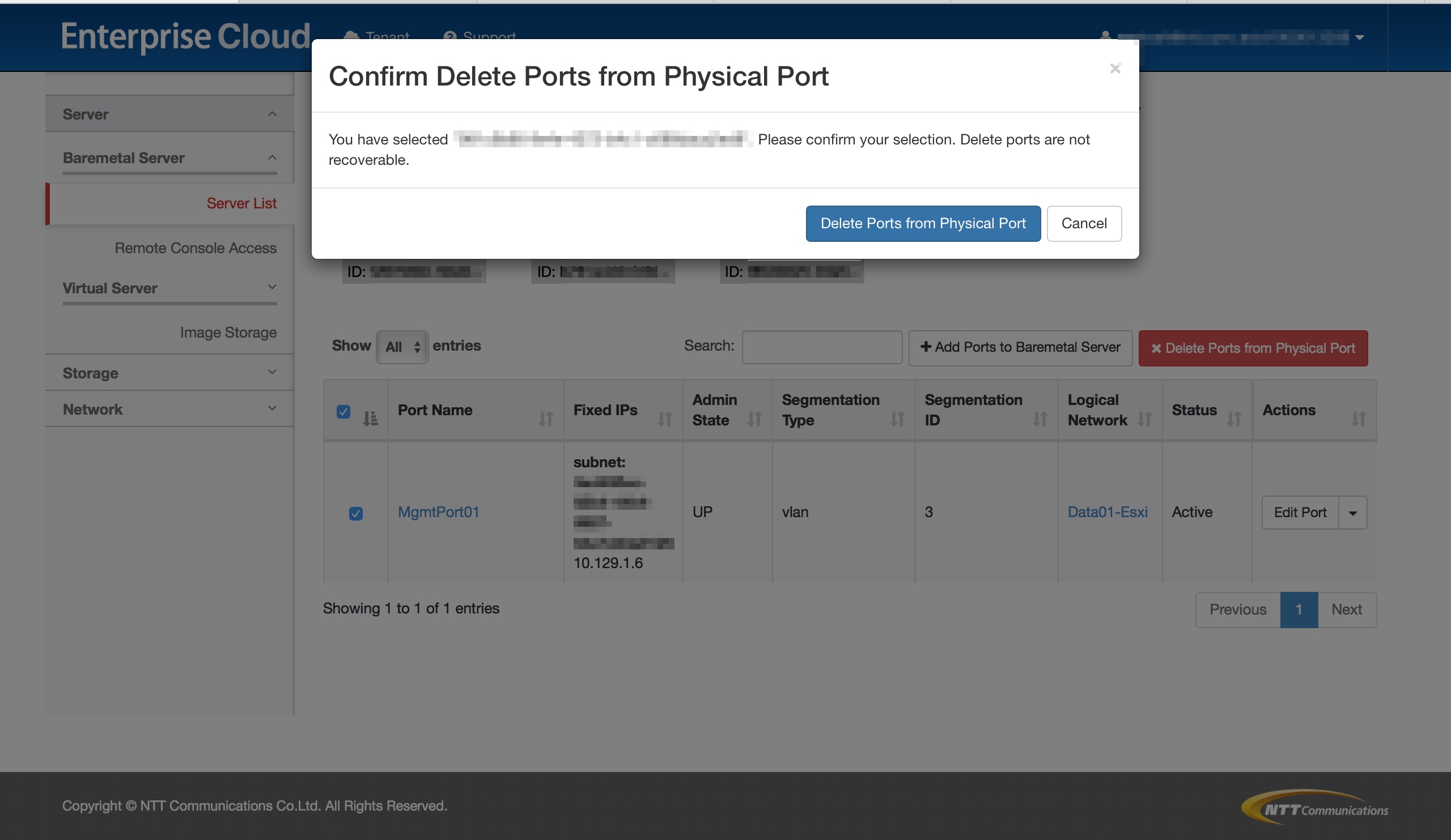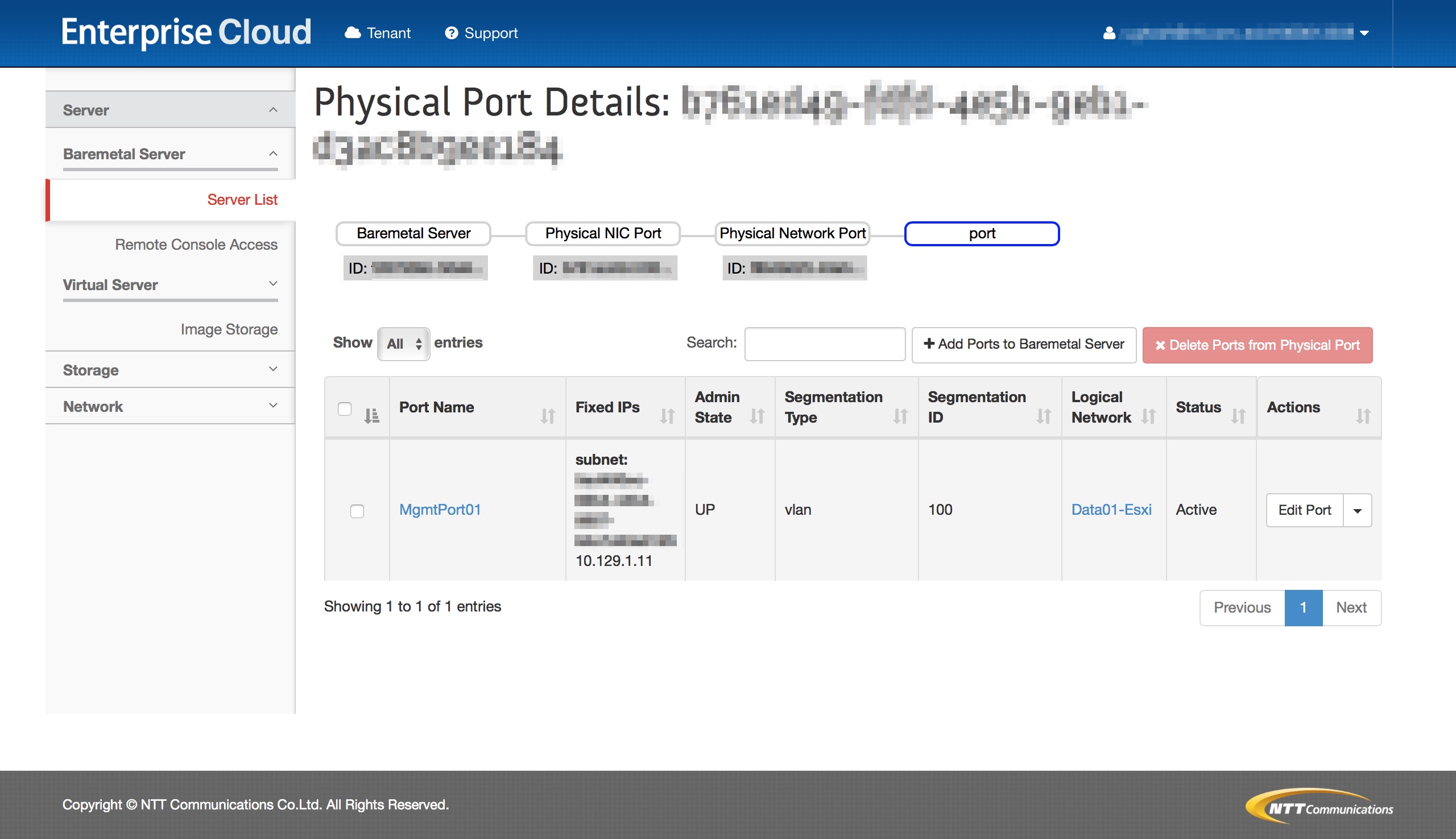 ベアメタルサーバーメニューで作成されるロジカルネットワークのポートはセグメントIDが3で設定されます。 セグメントIDを変更するために、ポートを削除し、当該ロジカルネットワークに新たなポートを作成します。