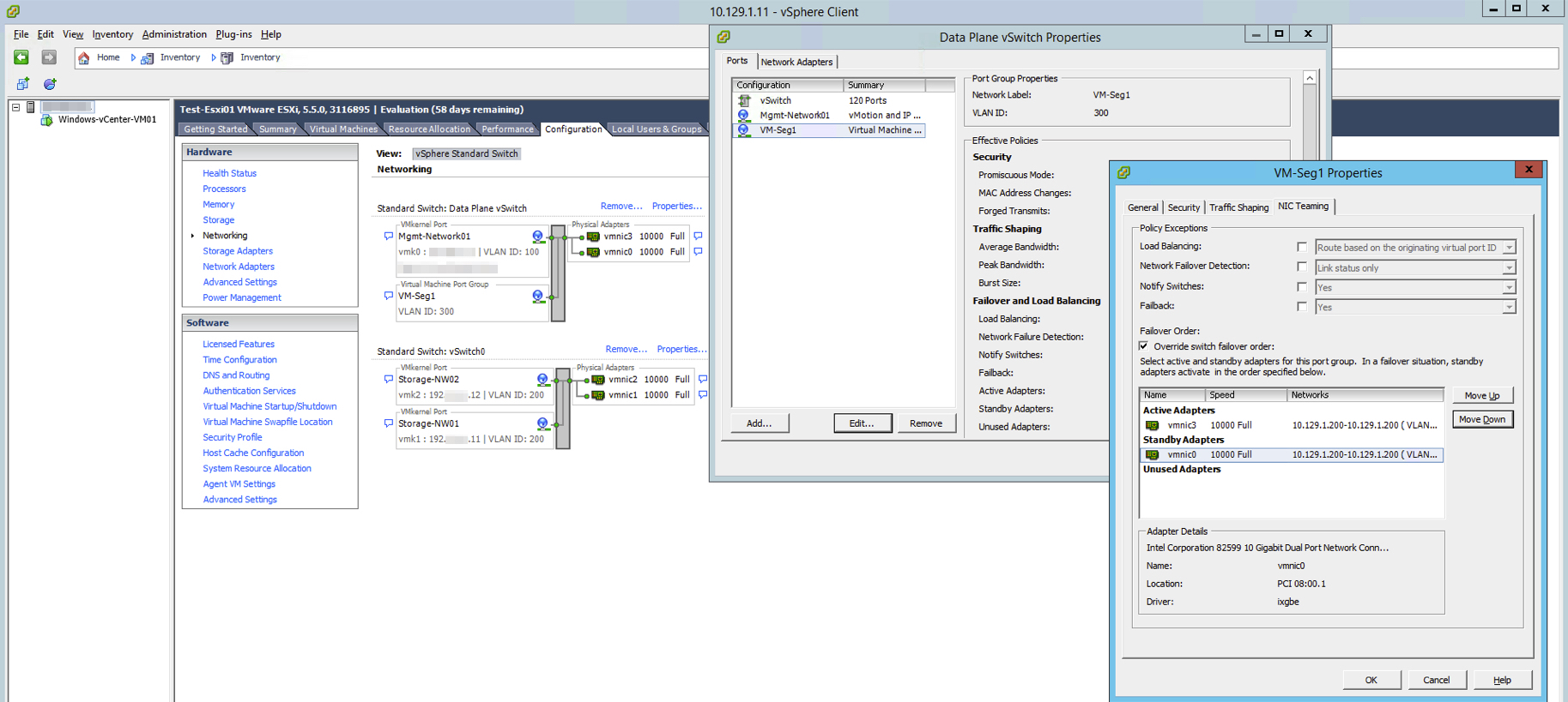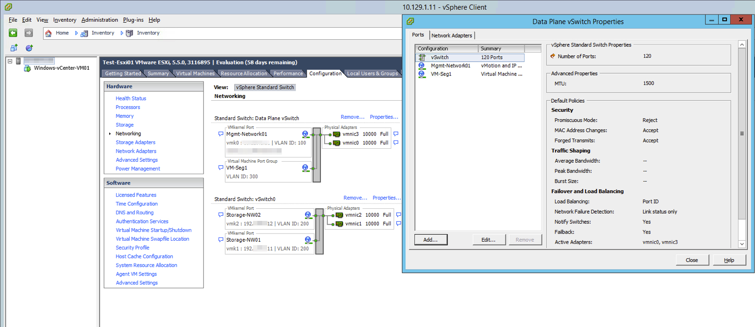 ロジカルネットワークの設定に合わせ、ESXiのネットワーク設定を変更します。 ここでは、セグメントID(vlan)とIPアドレスの画面を例示します。