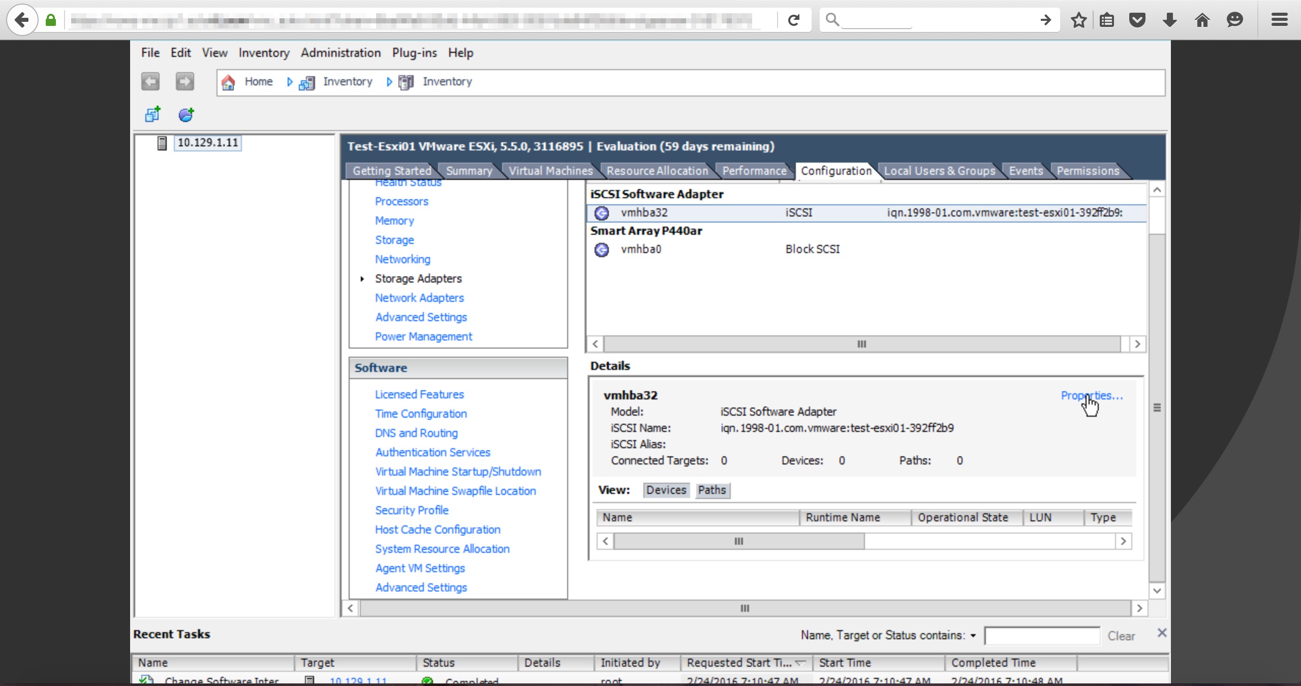 vSphereClientからVMware ESXi機能であるソフトウェアiSCSIアダプタを有効化します。