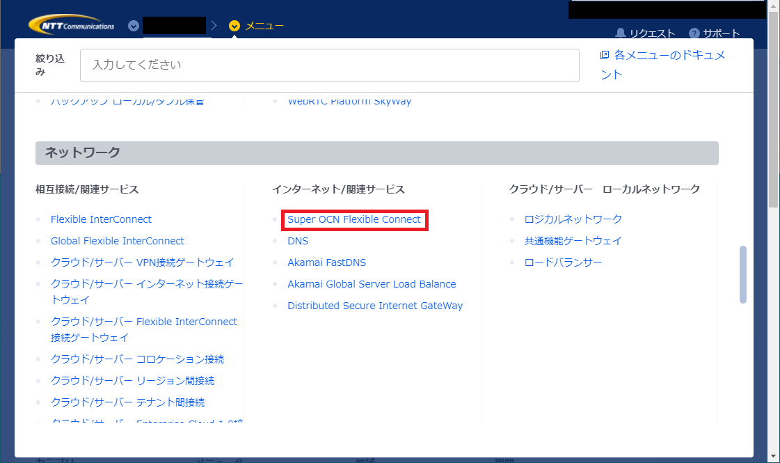 - 操作対象のワークスペースを選択後、[メニュー]タブをクリックし、[Super OCN Flexible Connect]をクリックします。