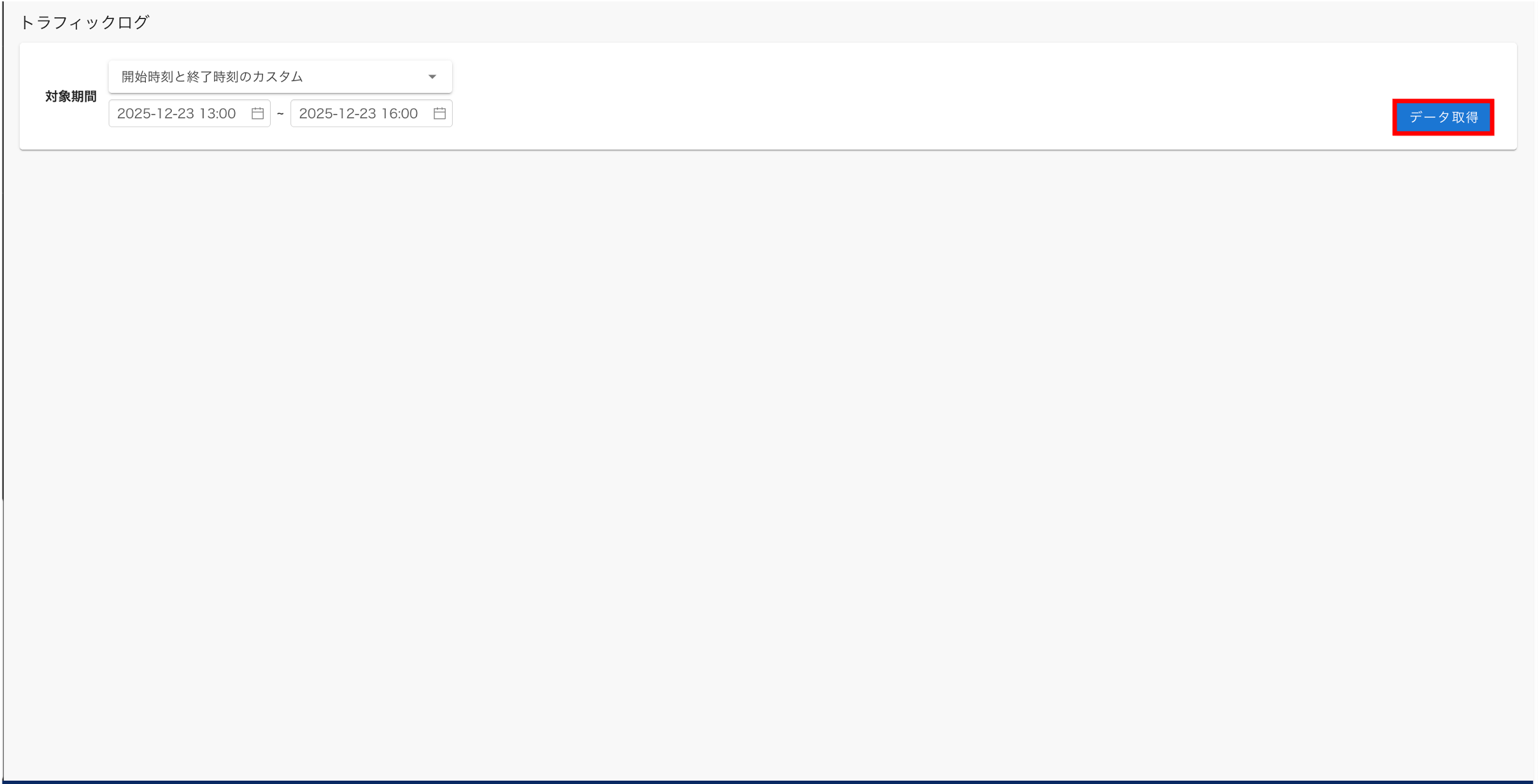 - 下記の通り、[対象期間選択]が表示されます。対象期間は"直近の1時間","直近の3時間","直近の5時間","開始時刻と終了時刻のカスタム"の4つから選択できます。"開始時刻と終了時刻のカスタム"は最大1ヶ月前まで検索可能で範囲は最大9時間になります。