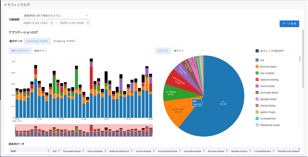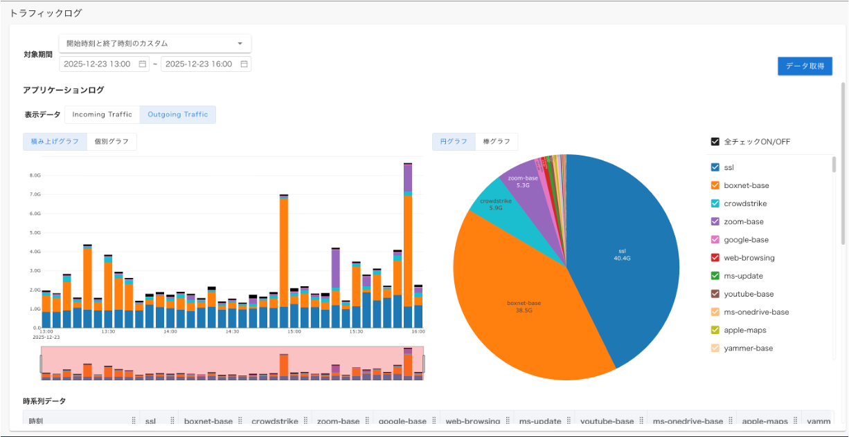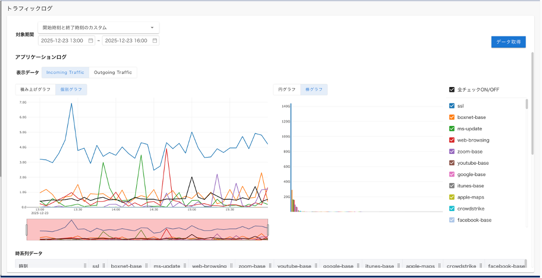 - グラフが描画描画されます。表示に時間がかかることがあります。スクロールすることで、 時系列データ、 アプリケーションデータ を確認できます。