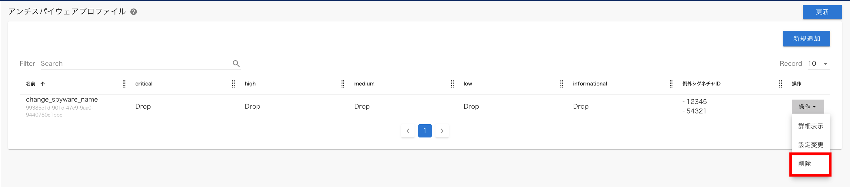 3. 削除したいアンチスパイウェアプロファイルを選択して[操作]→[削除]を押下します。