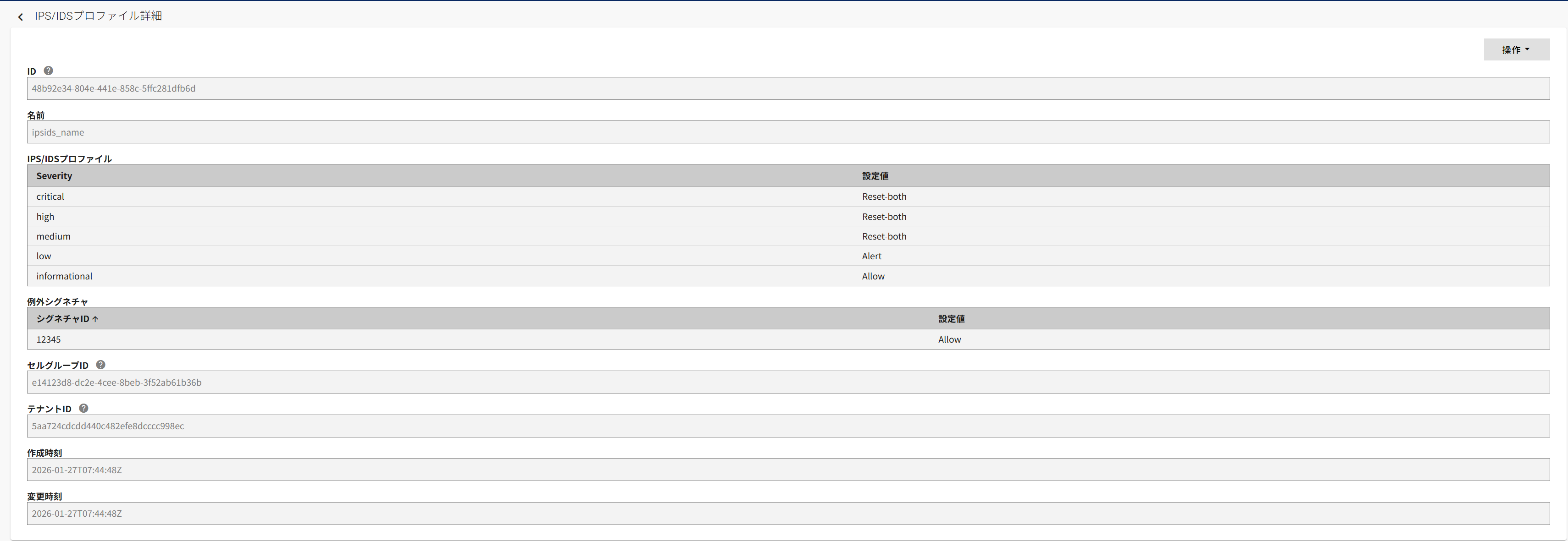 詳細を確認したいIPS/IDSプロファイルの[操作]→[詳細表示]を押下します。