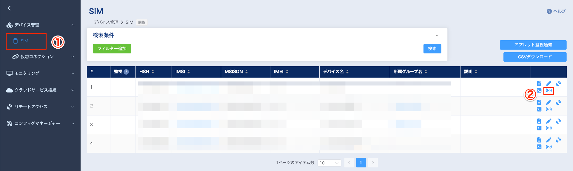 左側のメニューから、「デバイス管理」 > 「SIM」をクリックします。