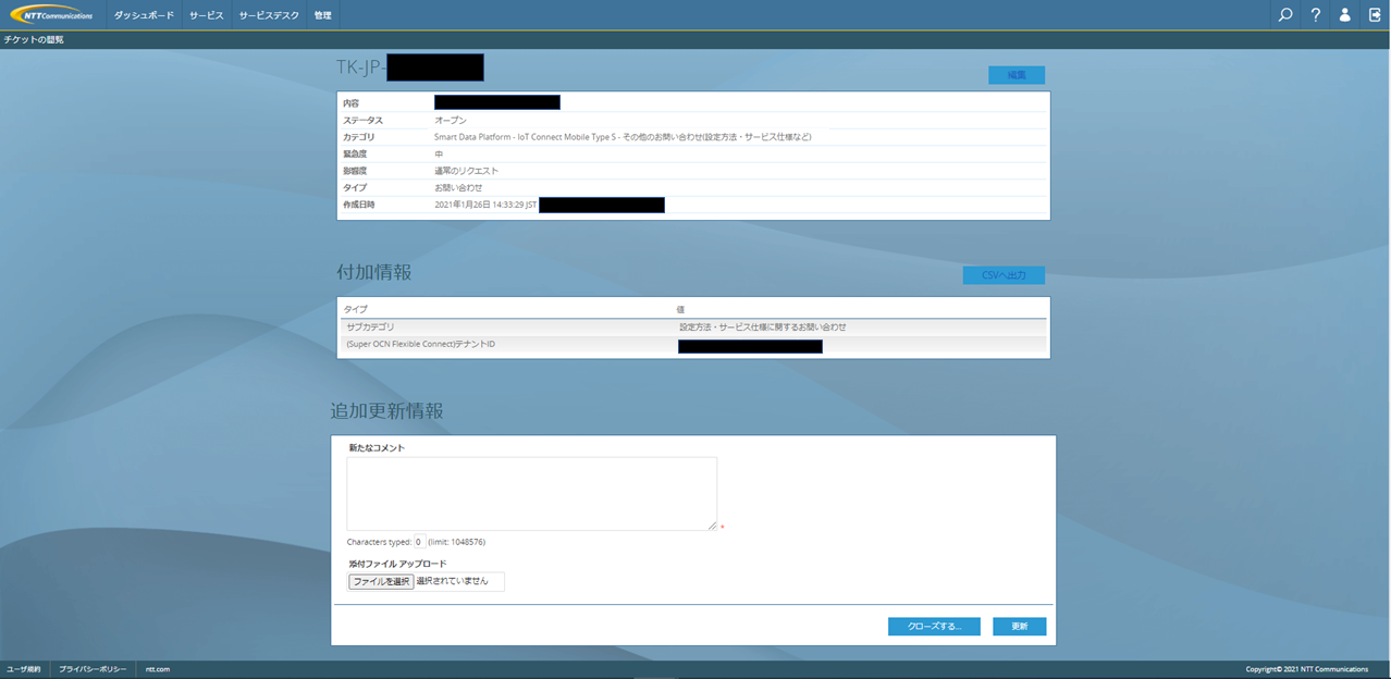 (3)追加更新情報に返信内容を入力し、「更新」を押下します。スクリーンショットやログファイルなどのファイルがある場合、チケットに添付することが可能です。