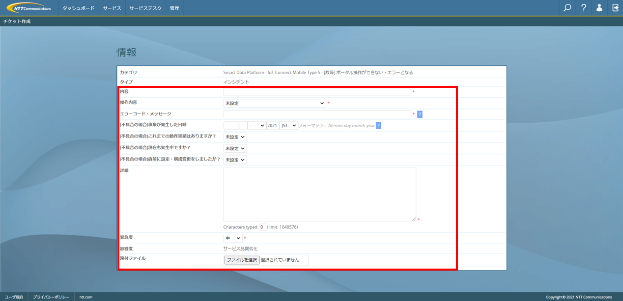 スクリーンショットやログファイルなどのファイルがある場合、チケットに添付可能です |