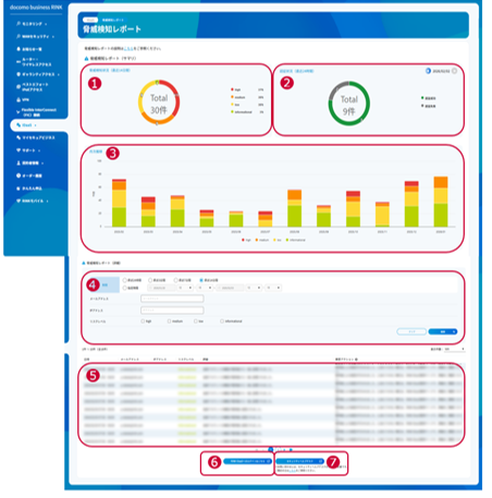 docomo business RINK IDaaSでは、docomo business RINK IDaaSの認証利用状況の生ログを元に、リスクレベルに応じた脅威を検知し提供します。脅威検知レポートの画面構成は以下のとおりです。