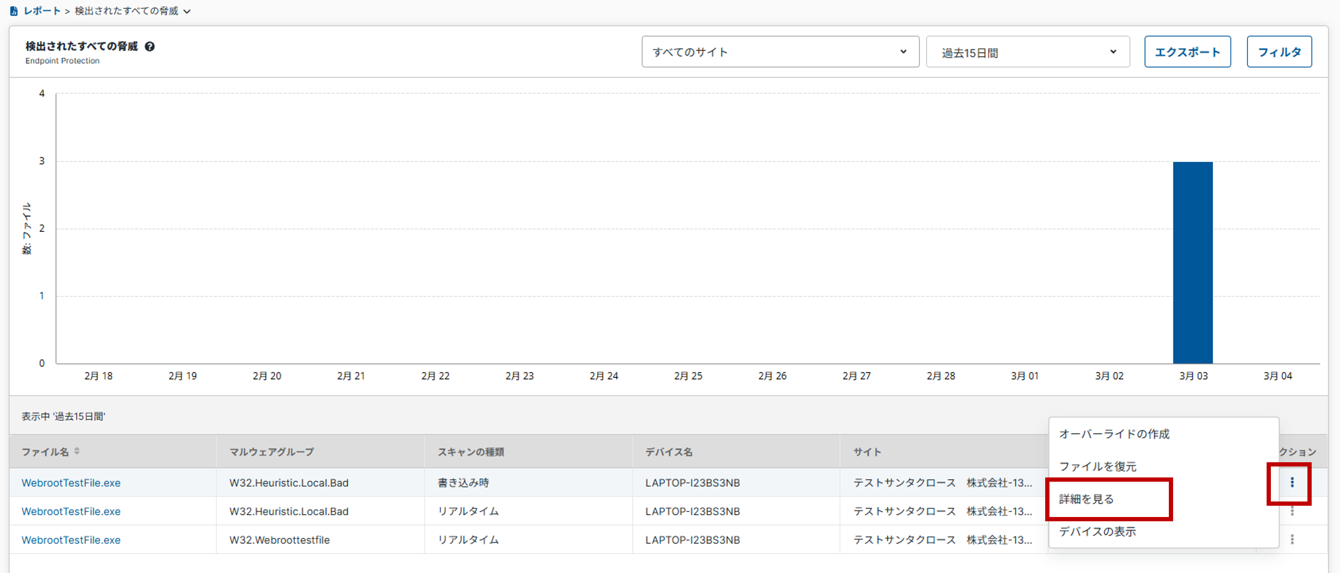(3)さらに詳細な情報を確認したい場合は、対象の脅威の「アクション」欄をクリックし、「詳細を見る」を選択します。
