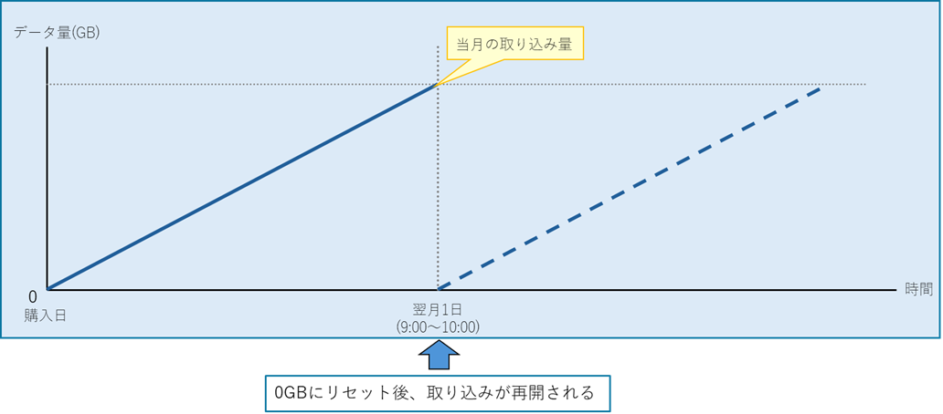 当月の取り込み量は、翌月1日の9:00~10:00(JST)(本時刻は目安であり前後する場合がございます)で0GBにリセットされます。