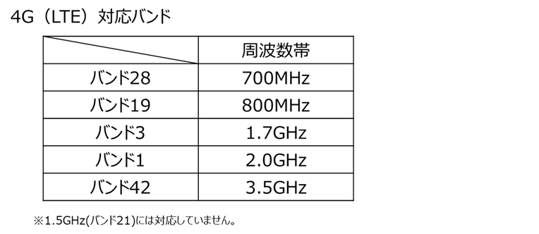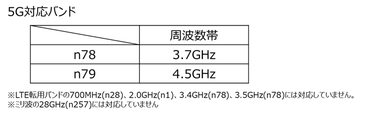 - ワイヤレスアクセスで用いるバンド帯については、下記の表をご参照ください。