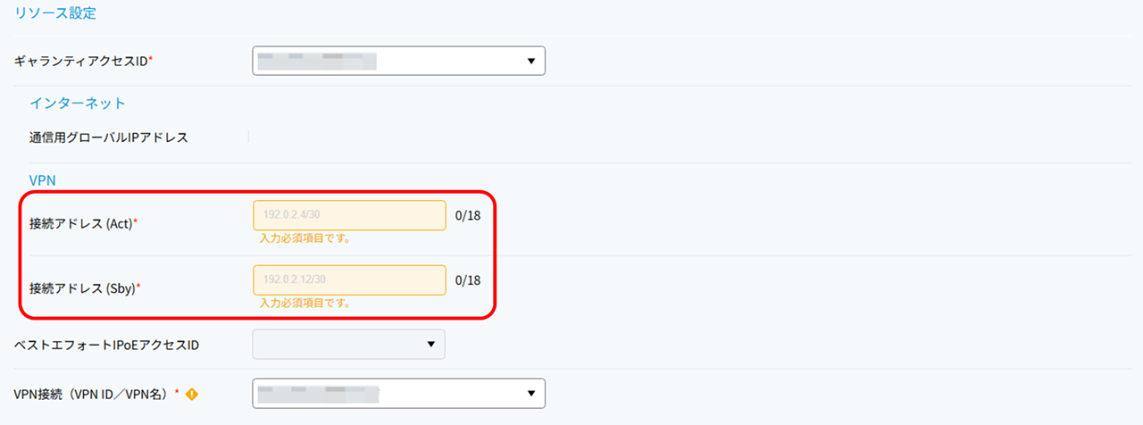 「接続アドレス (Act)」、「接続アドレス (Sby)」にて、サービスルーターとVPN網間のコネクションを確立するため、それぞれ/30のIPアドレスを設定します。