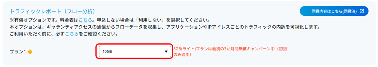 初めてトラフィックレポート(フロー分析)をご利用する場合、「お試しプラン5GB(ライト)」のお申し込みがおすすめです。