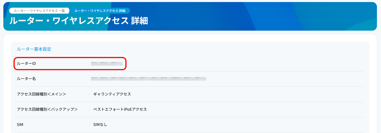 「ルーター・ワイヤレスアクセス 詳細」画面が表示されますので、表示結果が設定変更対象の「ルーターID」であることを確認します。