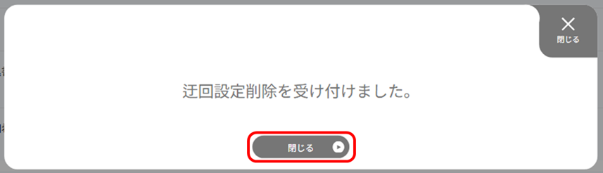 「迂回設定削除を受け付けました。」の画面が表示されますので、[閉じる]ボタンを押下します。