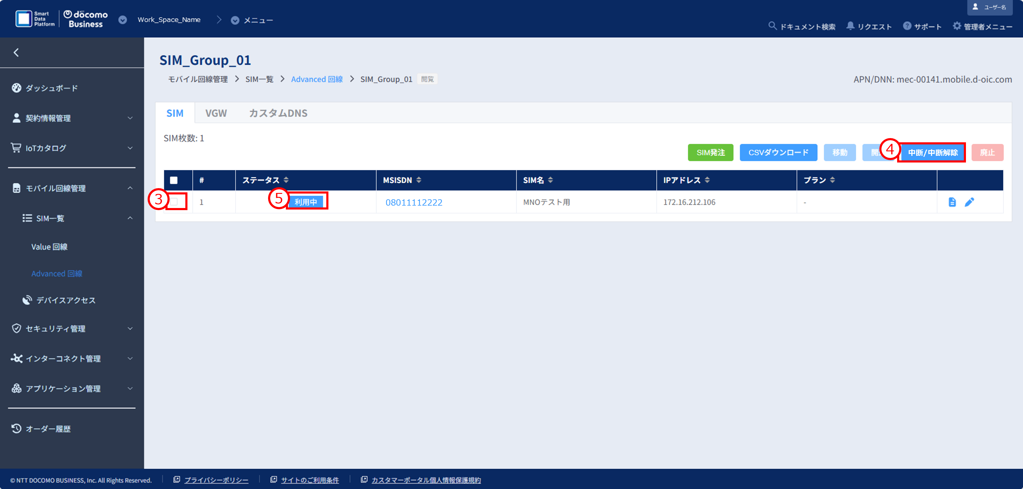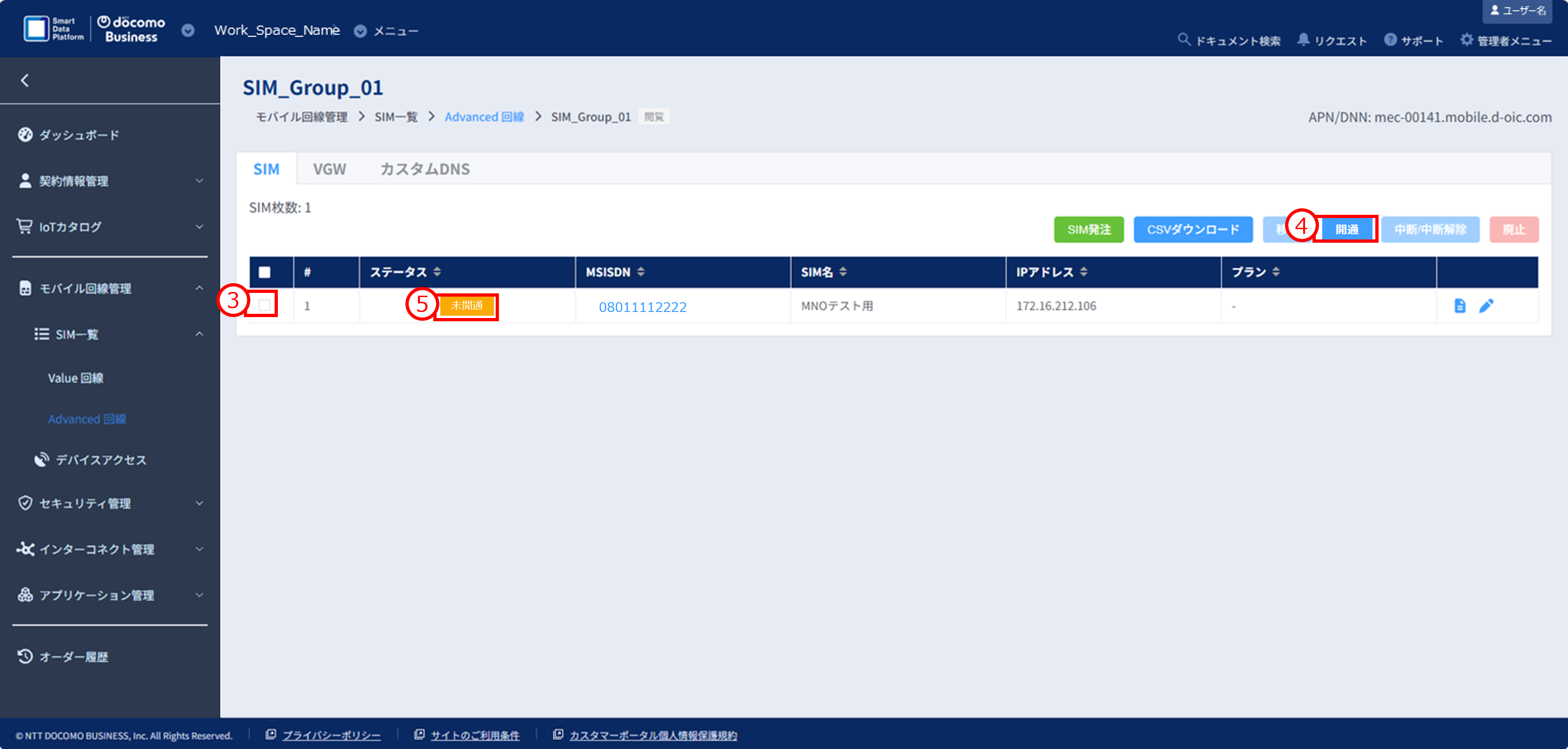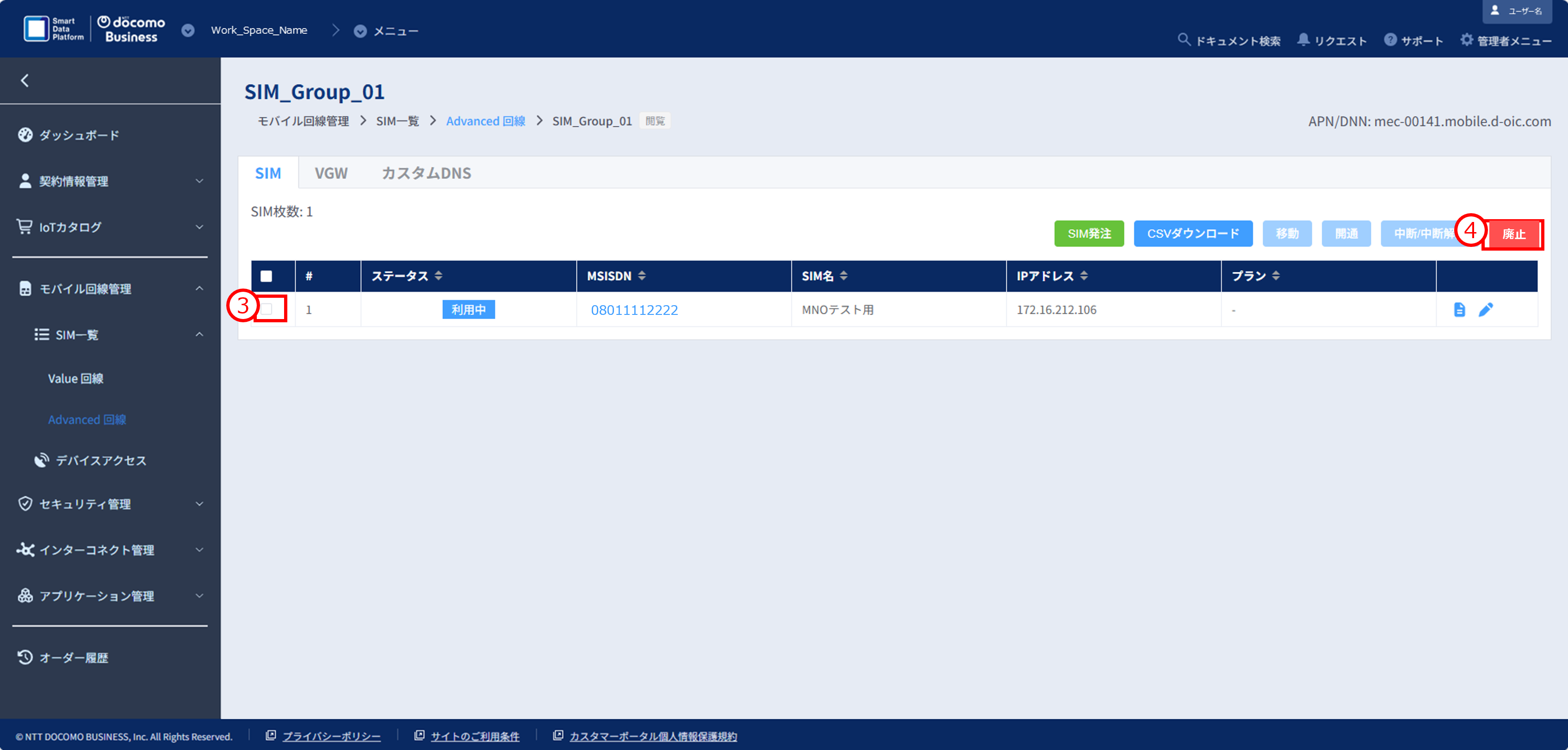 ①モバイル回線管理>SIM一覧>「Advanced回線」をクリックし、SIMグループ一覧画面を開きます。