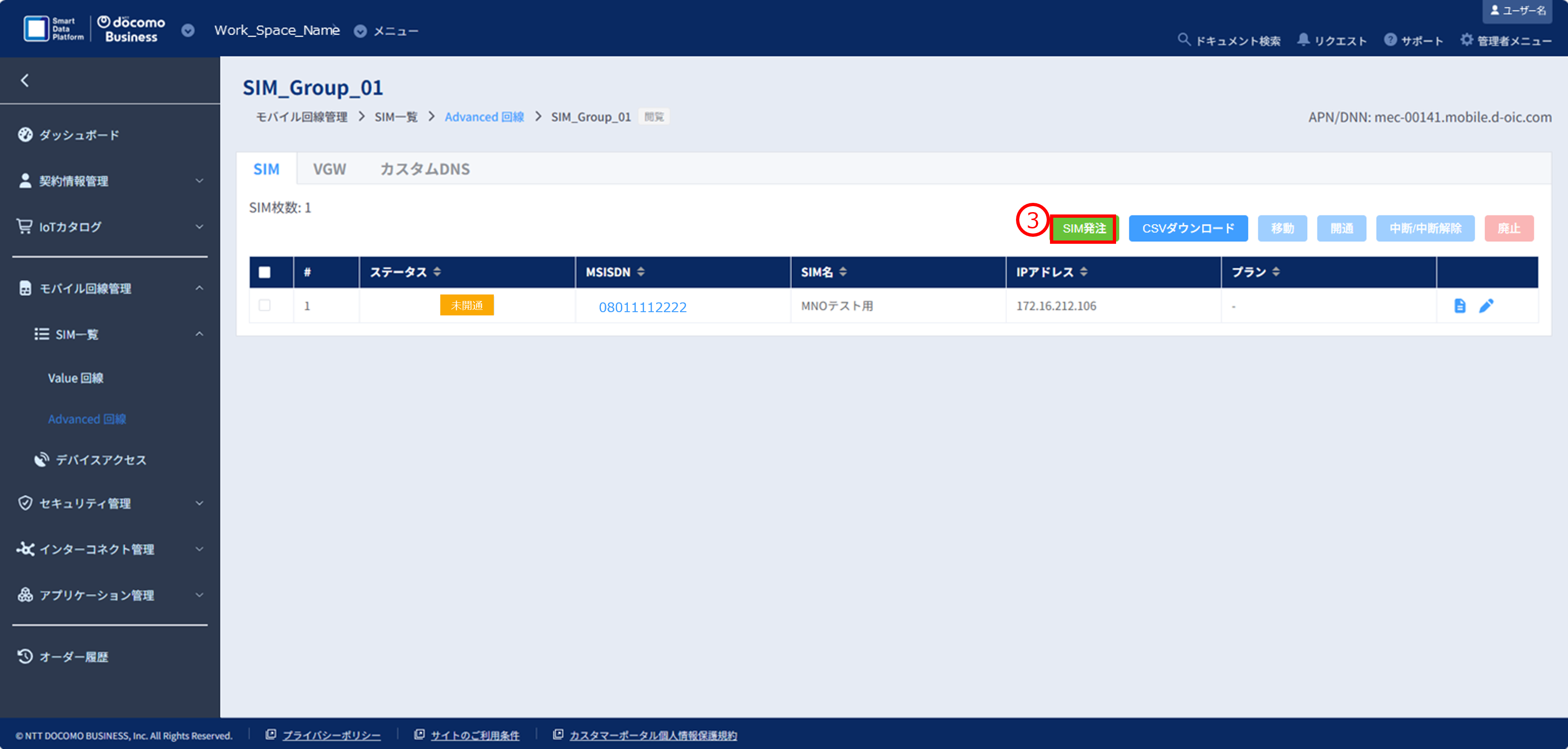 ③選択したSIMグループの画面に遷移するので、SIM発注ボタンを押下します。