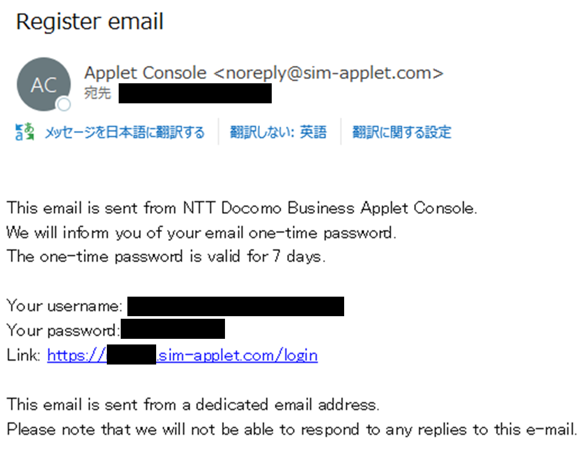 お申込後、1営業日以内にご登録いただいたメールアドレス宛に上図のようなメールが届きます。メールに記載された情報でアプレットコンソールにログイン、利用を開始いただくようお願いいたします。