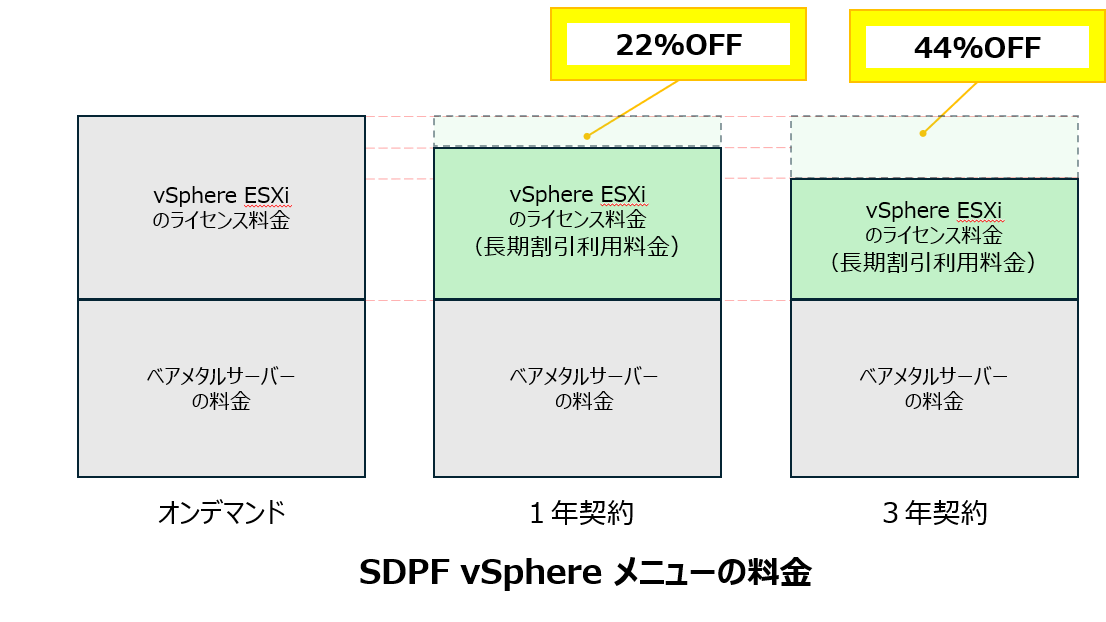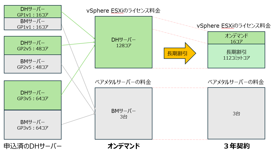 コミットの対象はvSphereライセンスです。ベアメタルサーバーは長期割引のコミットの対象外となります。