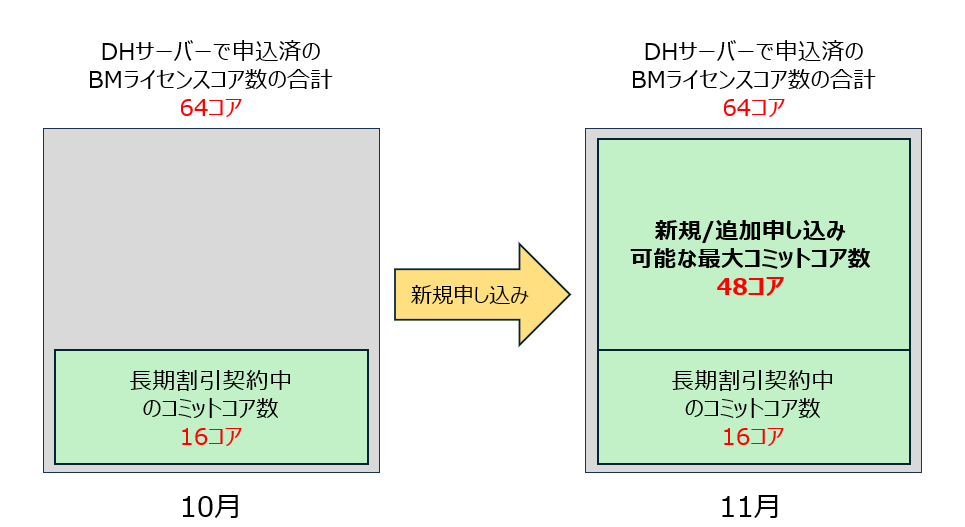 最大:(vSphere ESXi サーバーで申し込み済のベアメタルサーバーライセンスコア数の合計)ー(現時点で長期割引1年/3年契約中で来月のコミットコア数)