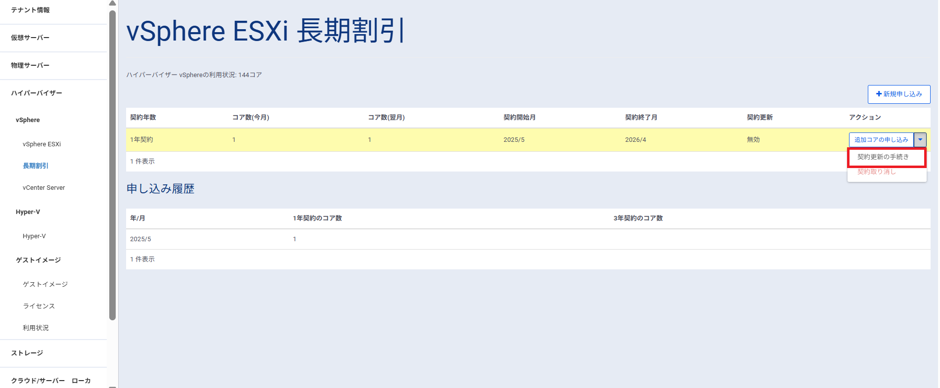 新規申し込みについては、 vSphere ESXi長期割引の新規申し込み方法 を参照してください。