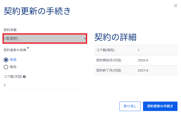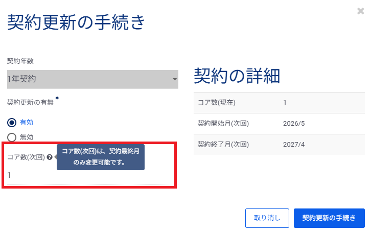 有効の場合は契約期間の満了後、現在のプランと同じ契約年数で更新されます。コア数(次回)で設定したコア数で更新されます。