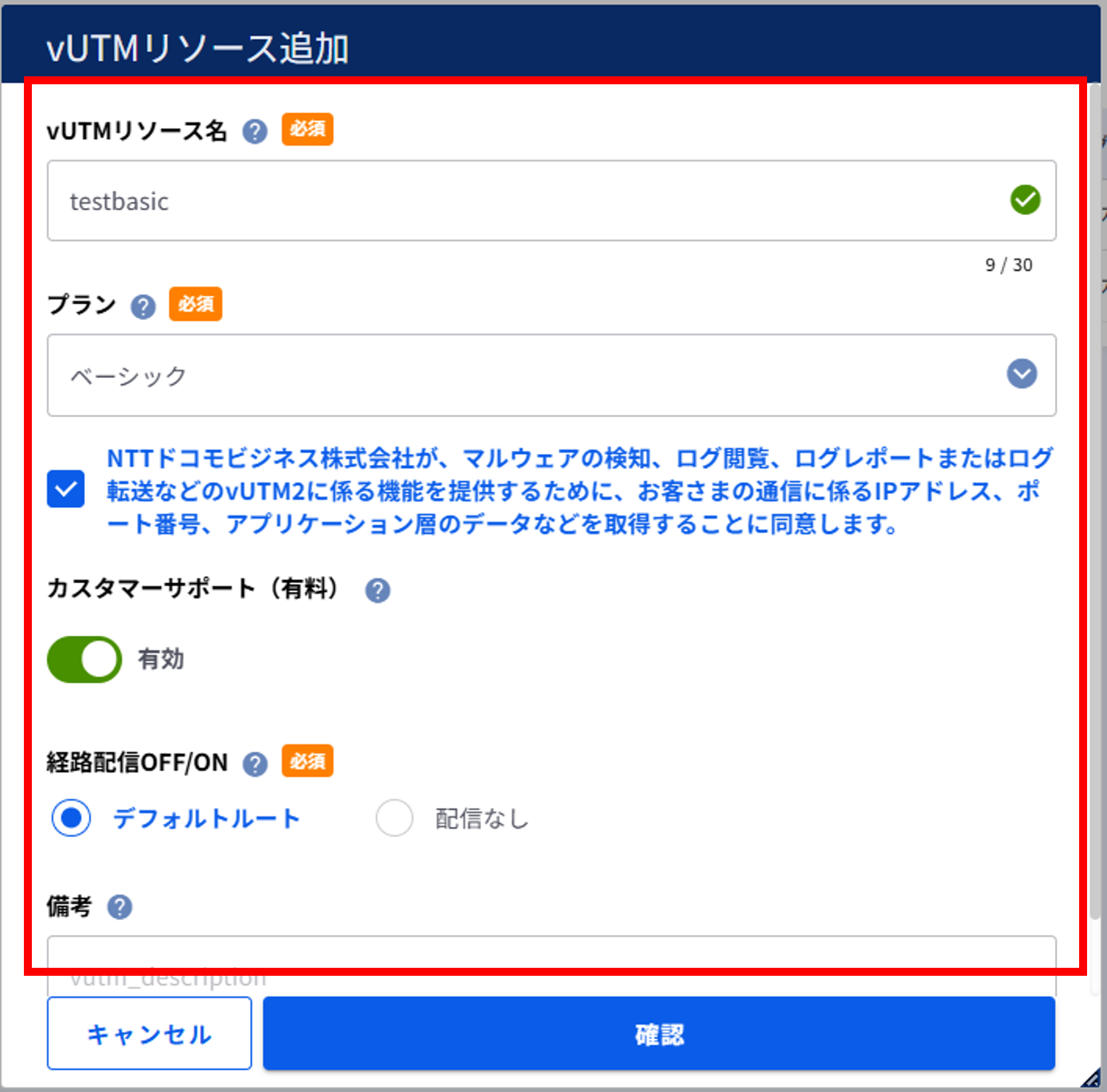 「vUTMリソース追加」画面で必要な情報を入力します。