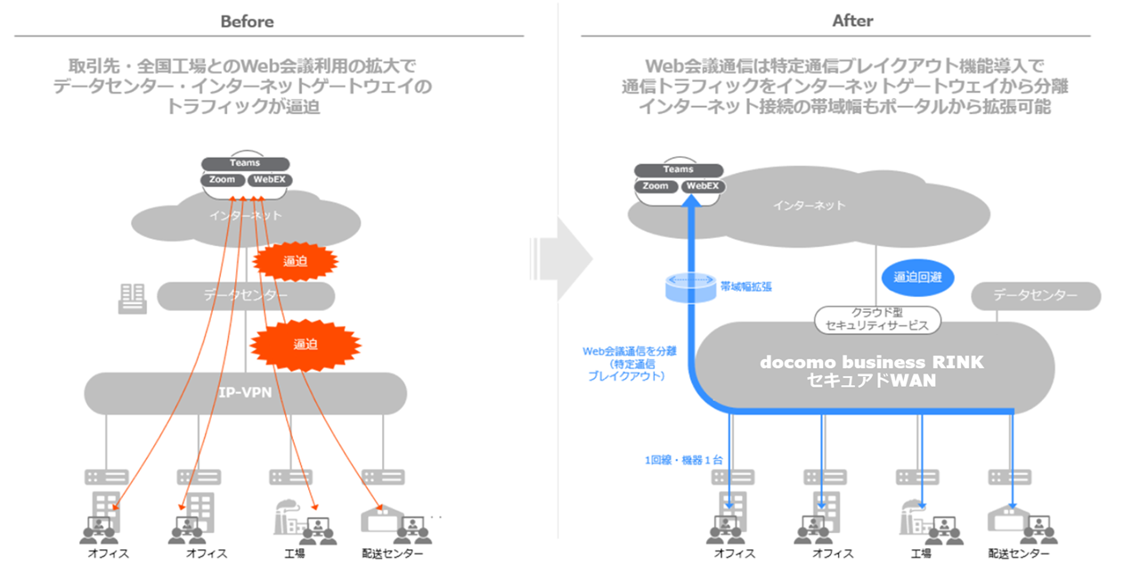 - 帯域が必要なWeb会議通信(注3)については、専用ポータル(docomo business RINKコンソール)よりSIなしで簡単にインターネット直通へ切り替えます 。VPNの帯域負荷も軽減