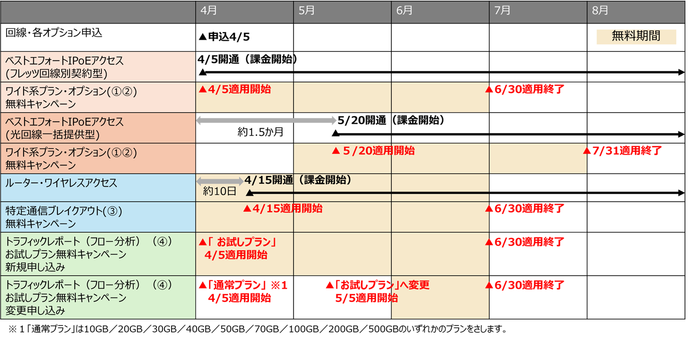 光回線一括提供型に付帯する場合 | フレッツ光の工事、IPoEアクセス回線の開通が完了※5、かつルーターの電源がONの状態において、コンソールにて「「IPoEアクセスプラン」設定を「ワイド」」かつ「「ワイドプラス for Web会議の利用」を「有効」」として申し込み完了したとき (ベストエフォートIPoEアクセスにおける該当回線のオーダーステータス:完了、リソースステータス:active) |