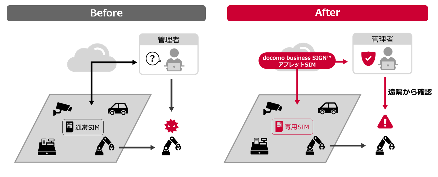 - 不正な通信が侵入した場合、リアルタイムに検知し、該当のSIMを特定し通信を遮断できるため、システムを高セキュリティな状態で運用可能