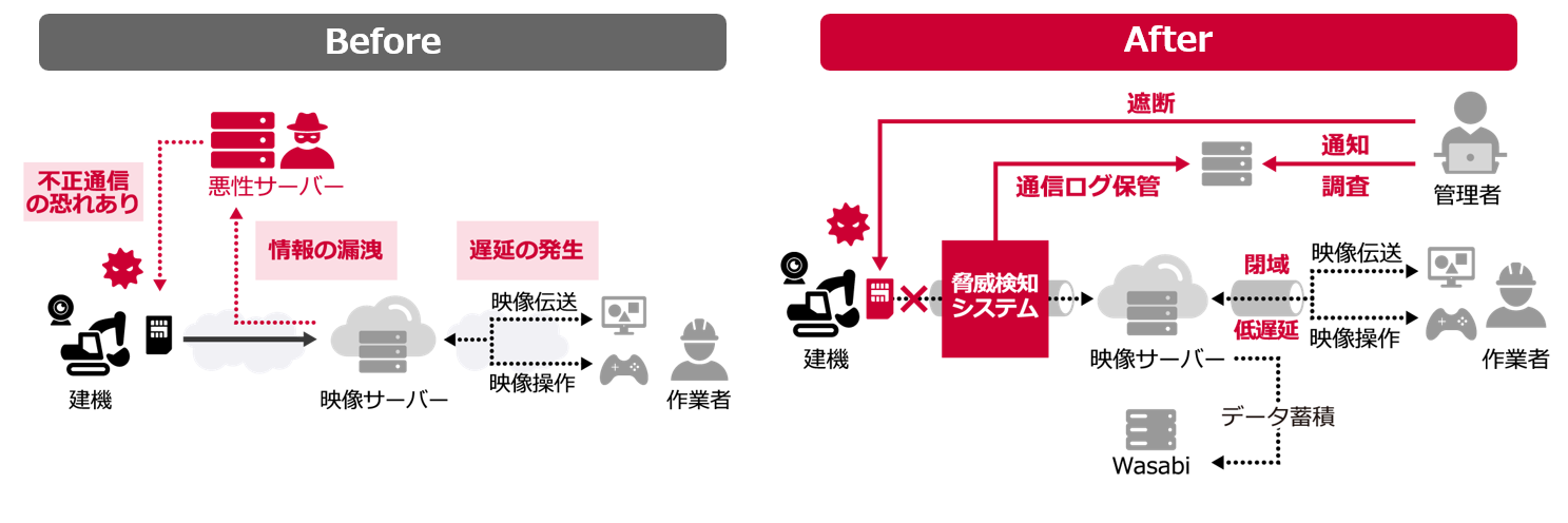 リアルタイム性の高い建機の遠隔操作を実現するとともに、不正通信の検知・遮断および通信ログ調査も可能