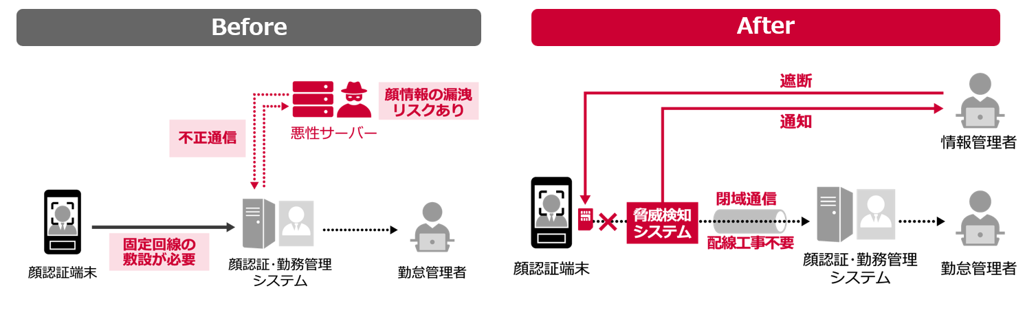 不正通信を検知し、遮断できる配線不要の顔認証による勤怠管理システムを構築可能
