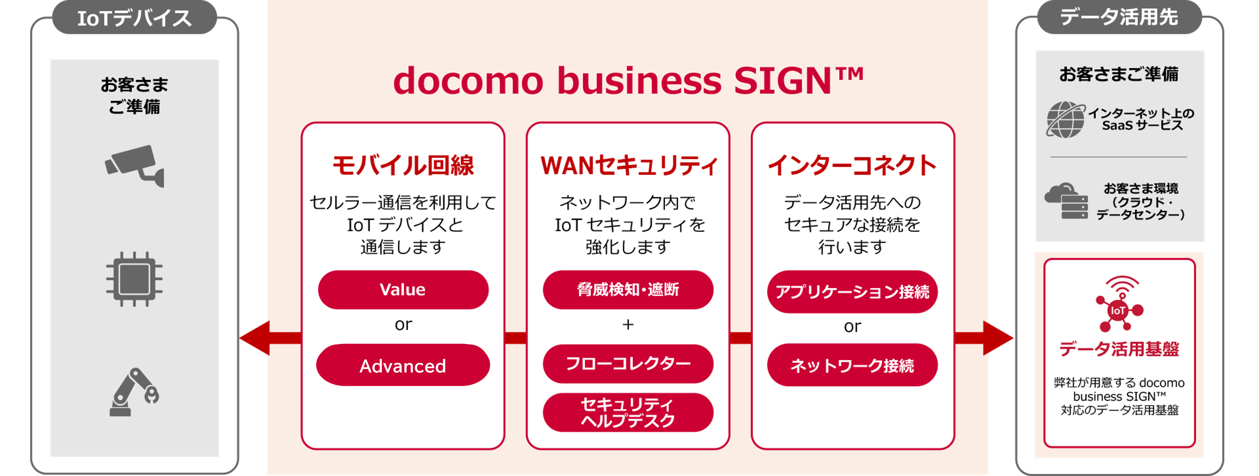docomo business SIGNは、これからのIoTに求められるセキュリティ機能を標準搭載しつつ、導入と運用のコストも削減するIoTサービスです。
