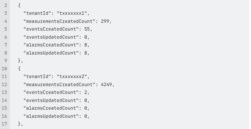 curl -u 'username:password' 'https://tenantname.je1.thingscloud.ntt.com/tenant/statistics/allTenantsSummary?dateFrom=2025-05-31&dateTo=2025-06-30' | jq