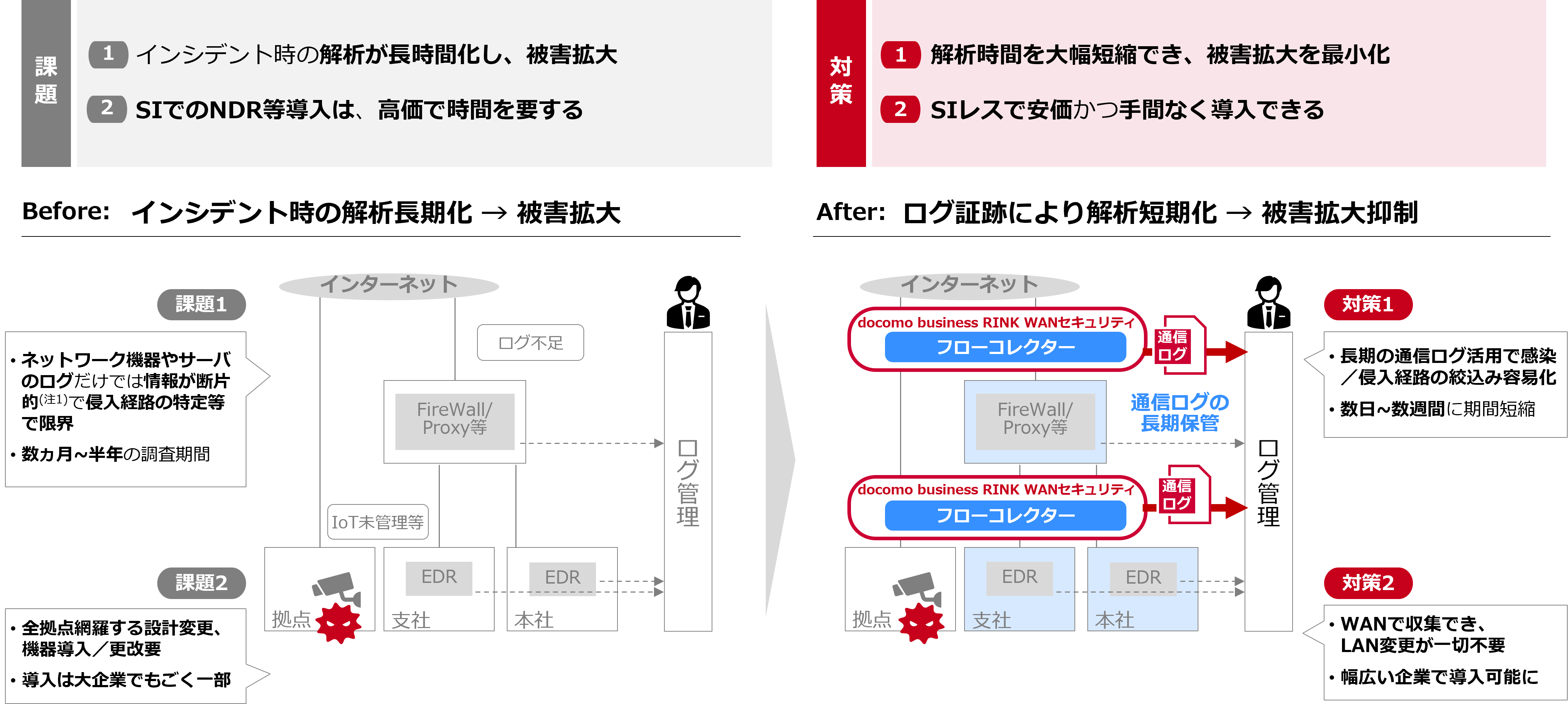 - 通信フローログ(ネットワークログ)の保管による万全の準備で、セキュリティインシデント発生時の早期対応、被害の最小化を実現